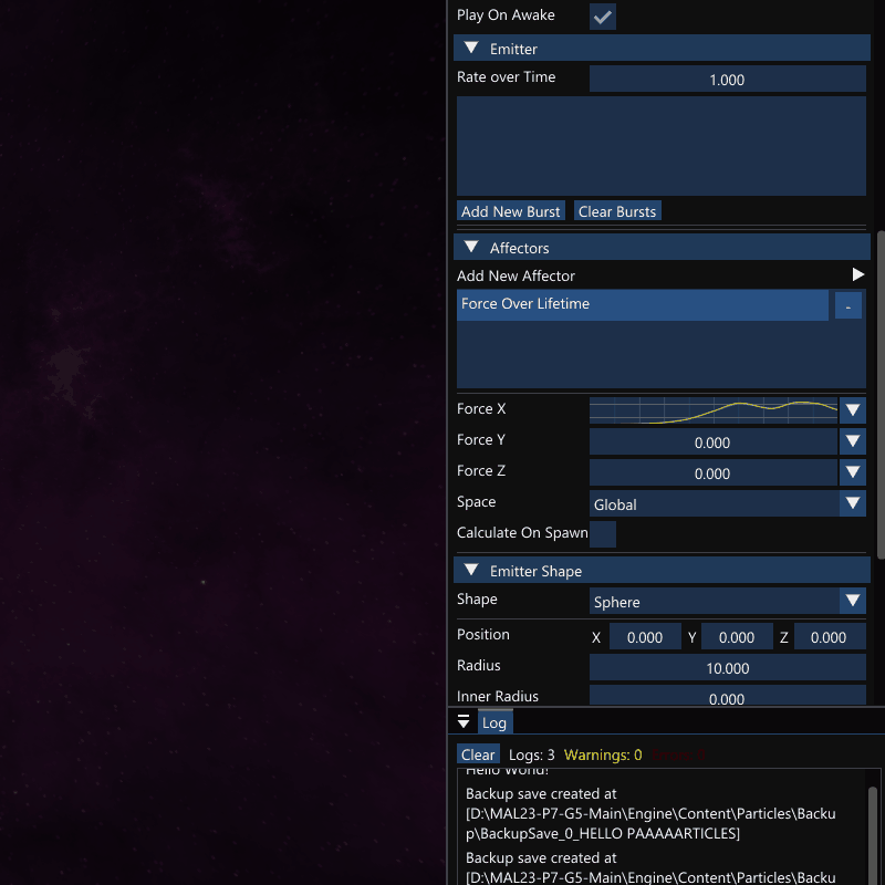A significant feature that was added to the front-end was the curve editor that enables for many new and interesting VFX to be created instead of being stuck to constant values. Smooth interpolation was achieved via Catmull-Rom splines. It was also made possible to use a minimum and maximum range that produces random values between.